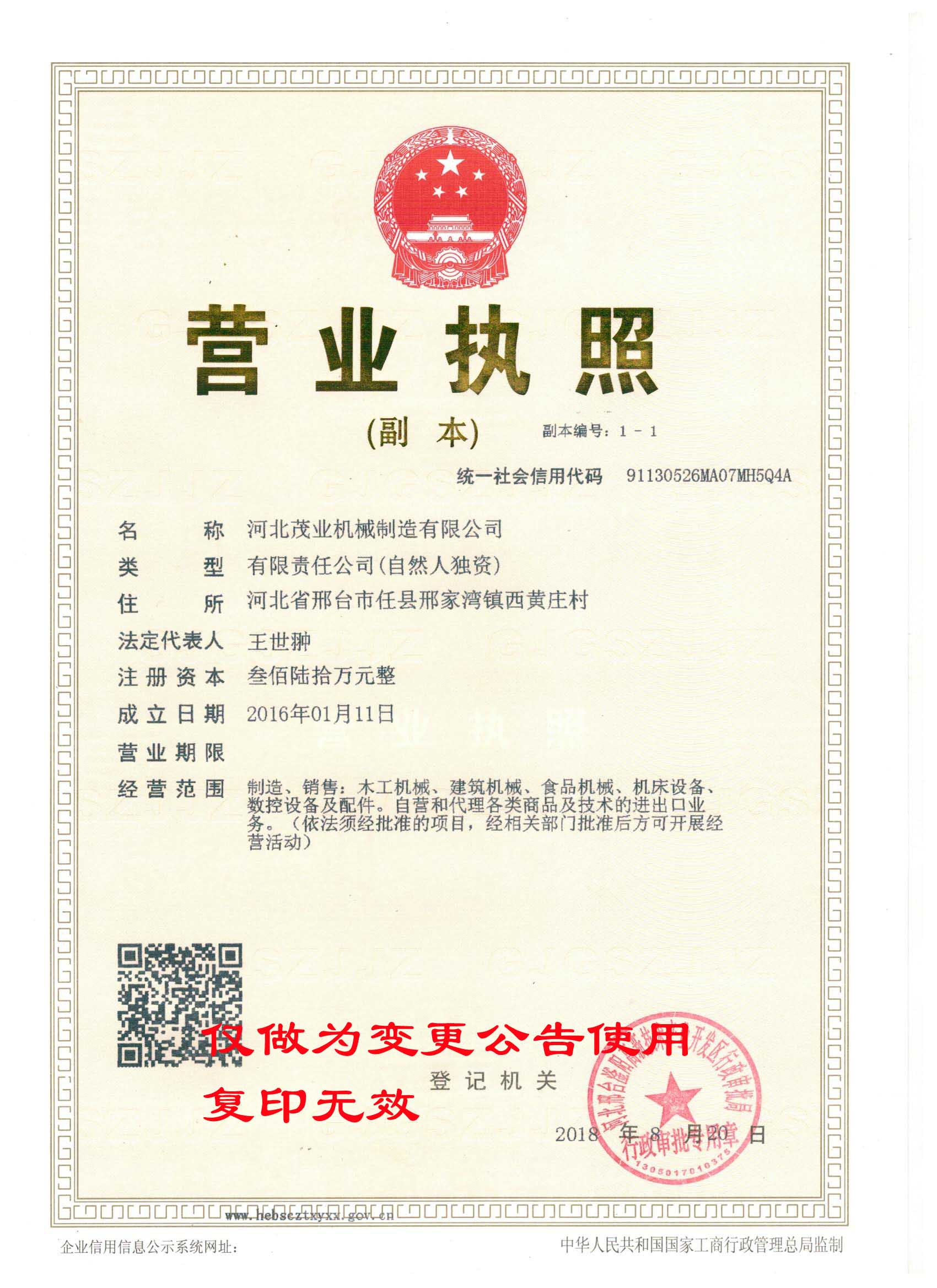 我司邢臺茂業(yè)機(jī)械制造有限公司,因公司業(yè)務(wù)發(fā)展的需要,現(xiàn)已整體變更為河北茂業(yè)機(jī)械制造有限公司,并于2018年8月20日取得河北邢臺滏陽高新技術(shù)產(chǎn)業(yè)開發(fā)區(qū)審批局頒發(fā)的營業(yè)執(zhí)照。現(xiàn)將有關(guān)事項(xiàng)公告如下: